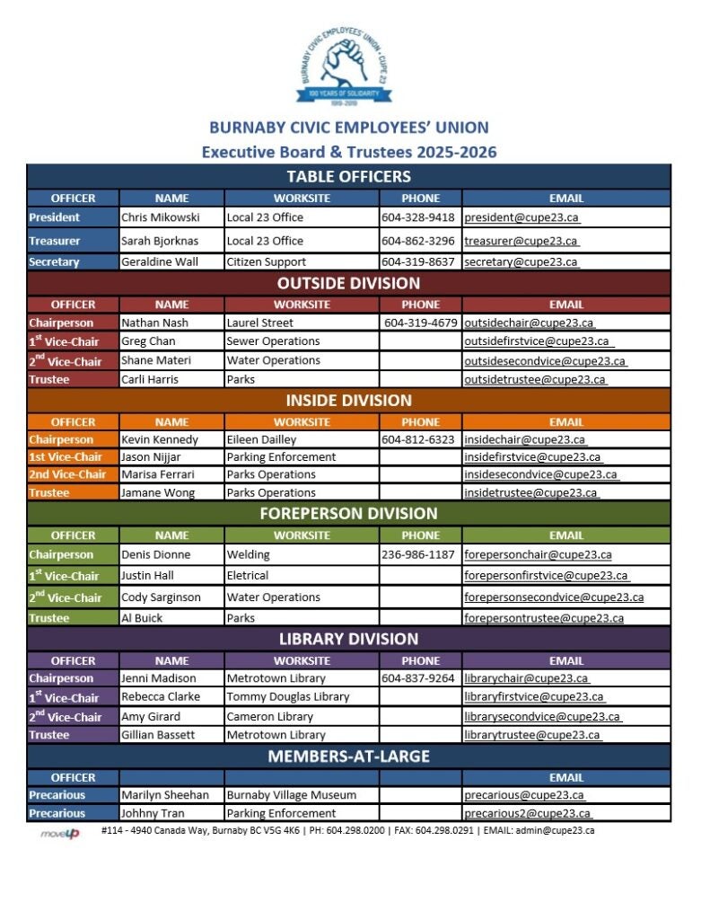 CUPE 23 has an Executive Board made up of 3 Table Officers and Officers elected from its 4 divisions. Each division elects a Chairperson, Vice Chairperson and 2nd Vice Chairperson. There are 2 At Large positions for Precarious Workers (elected from any division, must be Aux, RPT, TPT, or TFT) There is also a Trustee representing each division.